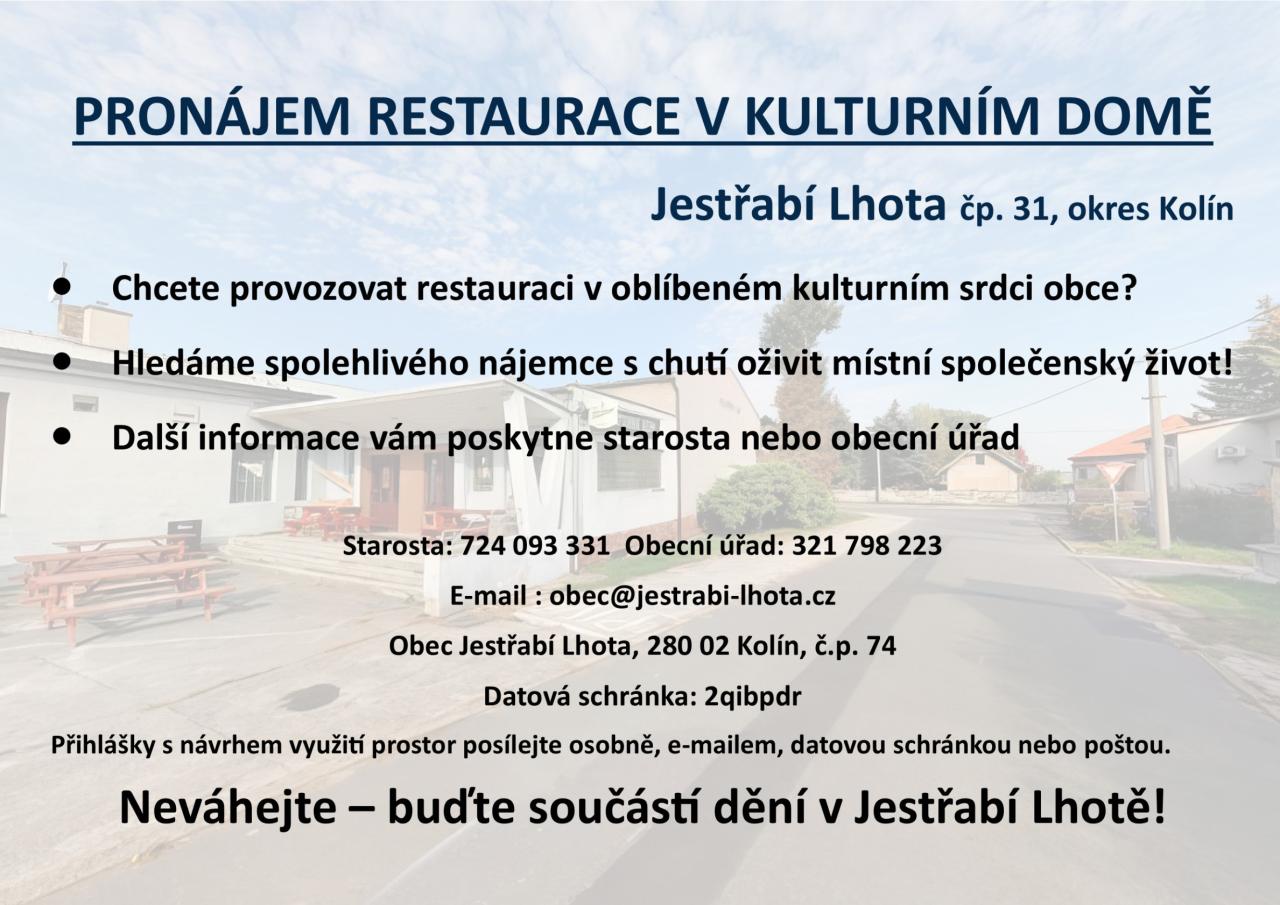 Nabídka pronájmu restaurace v kulturním domě v Jestřabí Lhotě